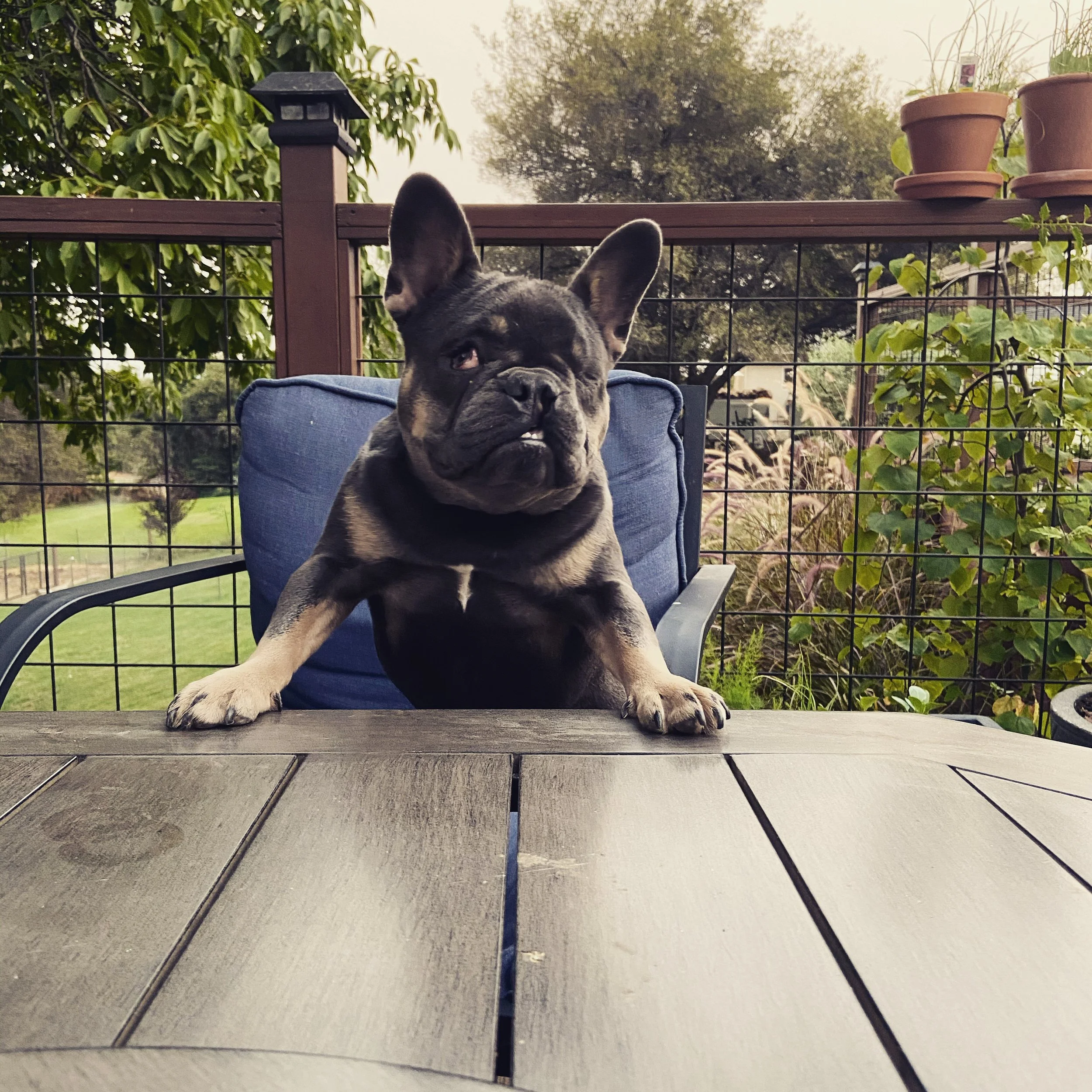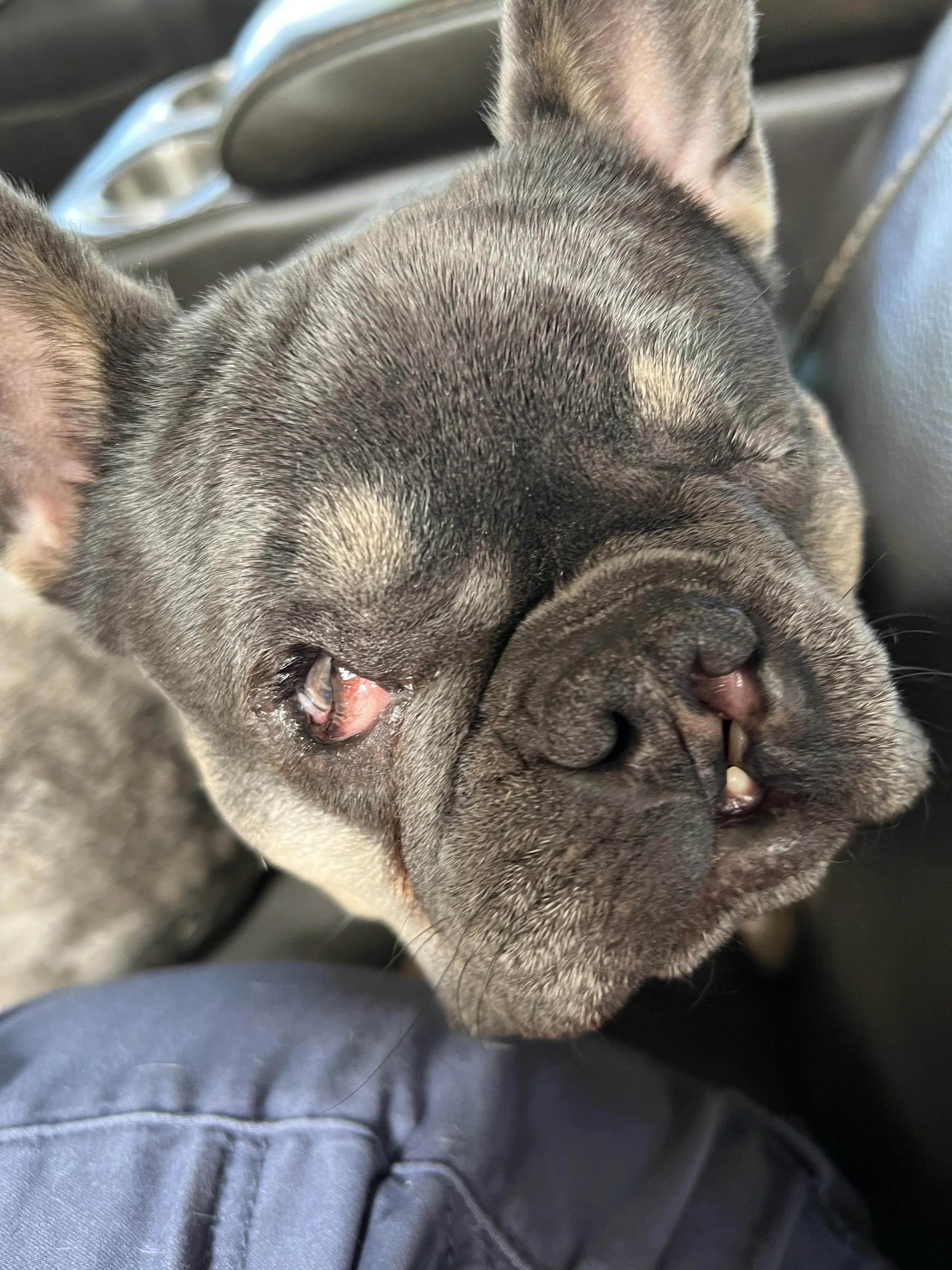 As she grew from a tiny puppy to an adult one of her malformed eyes developed glaucoma and had to be removed. The result is a small and mostly blind French Bulldog that has a heart of a lion. She quickly learned to navigate her environment despite her handicaps and loves to wrestle and play with her housemates.
